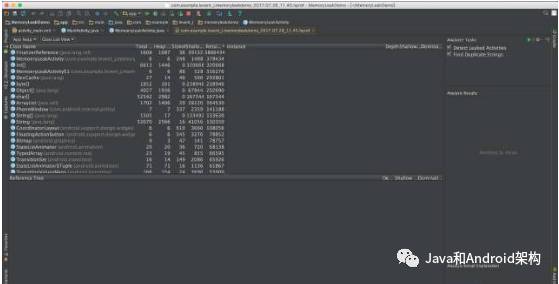 接下来由android studio来分析一下。在反复几次上面的操作之后,返回MainActivity,然后点击dump java heap按钮,然后等一会儿,android studio在为我们dump此时的horof文件。在成功后,会自动打开: