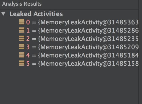 首先,我写了两个activity,一个MainActivity,一个MemoryLeakActivity,逻辑是:MainActivity中有个按钮,点击会调到MemoryLeakActivity,在这个activity中会故意发生内存泄漏,代码如下: