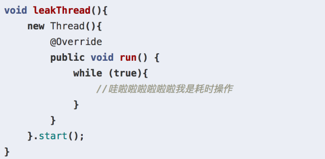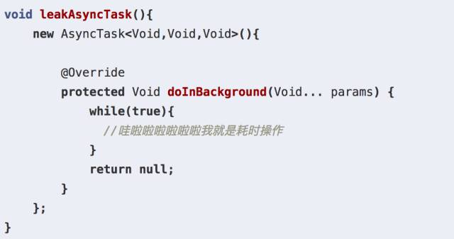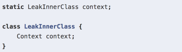 static这个关键字使一个变量变为只和这个类相关的类变量,和实例无关。他的生命周期是很长的,贯穿于app的启动到关闭。因此只要用一个static引用一个大对象,就可以泄漏了!举个例子:
