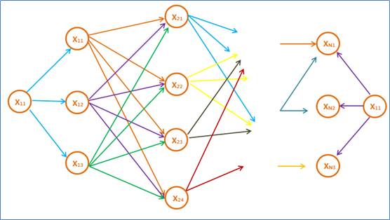 (2)对于第二个状态X2的所有节点,要计算出从S到它们的最短距离。对于特点的节点X2i,从S到它的路径可以经过状态1的n1中任何一个节点X1i,对应的路径长度就是d(S,X2i) = d(S,X1i) + d(X1i,X2i)。