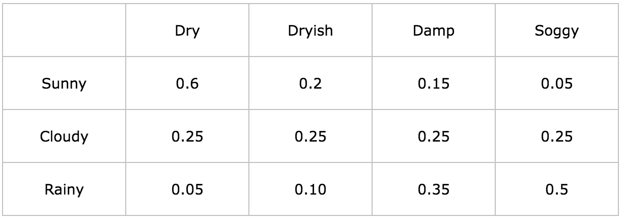 (1)天气只有三类(Sunny,Cloudy,Rainy),海藻湿度有四类{Dry,Dryish, Damp,Soggy },而且海藻湿度和天气有一定的关系。