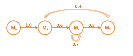 在这个马尔可夫链中,四个圈表示四个状态,每条边表示一个可能的状态转换,边上的权值是转移概率。