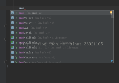 当你随便在一个java类文件中写上bmob的时候就会出现很多bmob的相关方法了,至此配置bmob已经全部完成,接下来开始使用bmob吧!