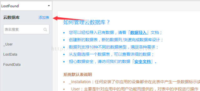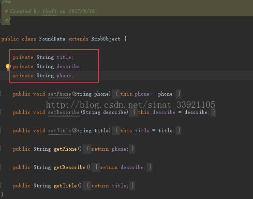 这里我根据项目需要创建了一个FoundData数据表,我们创建数据表的时候记住要继承自Bmobject这个类,然后定义相关属性,添加set与get方法,在我们的项目中成功创建数据表之后我们需要在bmob后端控制太添加数据表与之形成对应:
