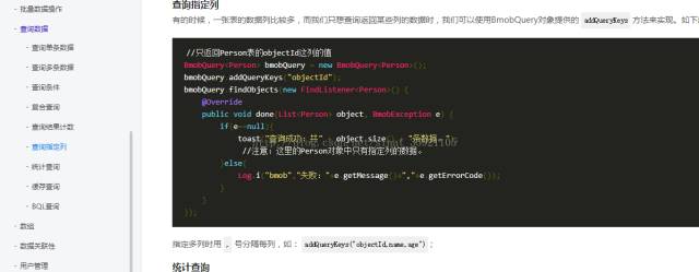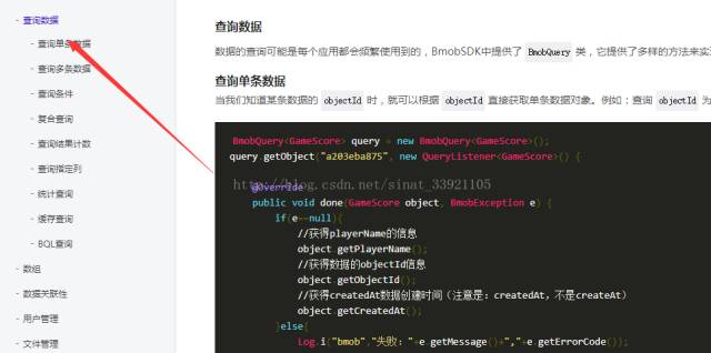 这是关于bmob对于android开发的一系列操作,我们需要找到查询数据的方法: