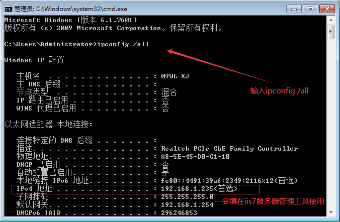 2-10:输入ipconfig/all,找到ip(一会添加vnc服务器时需要填写)。