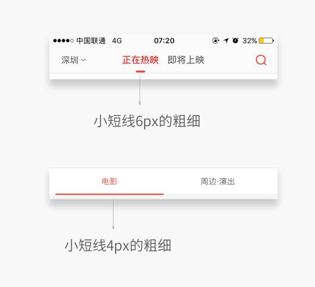 二级导航一般没有多余的信息和图标,所以小短线用的长一点也没关系,反而让层级更清晰,页面更饱满。