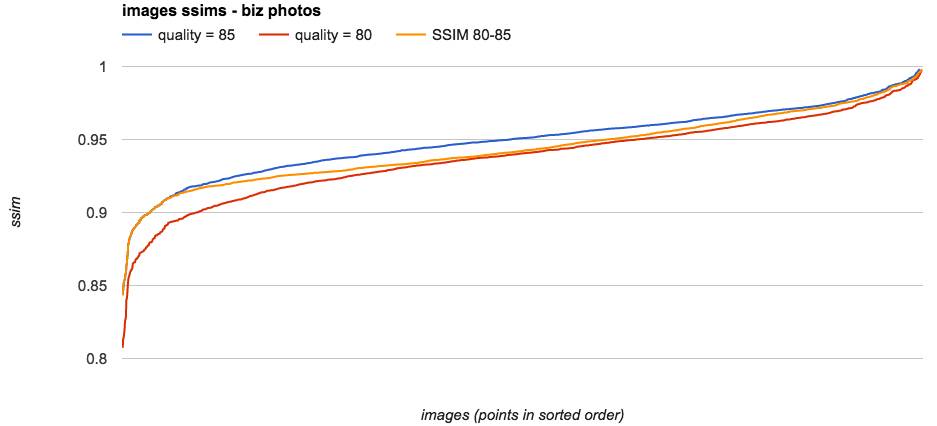 所以我们采取了第二种方法:使用对分的算法生成不同质量水平的候选图像,并通过使用 pyssim 函数来计算其结构相似性度量(SSIM),来评估每个候选图像的质量下降,直到该值处于可配置但阈值也还处于静态。这允许我们选择性地降低文件的平均大小(和平均质量),仅仅针对那些已经开始产生肉眼可识别的质量下降的图像。