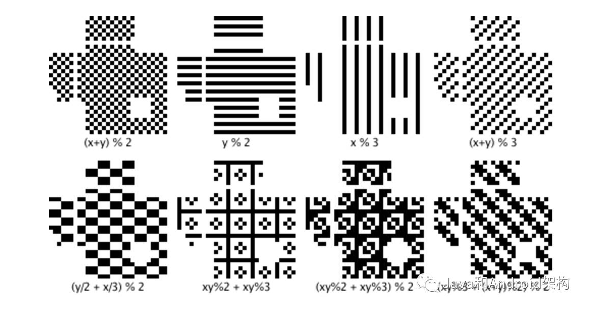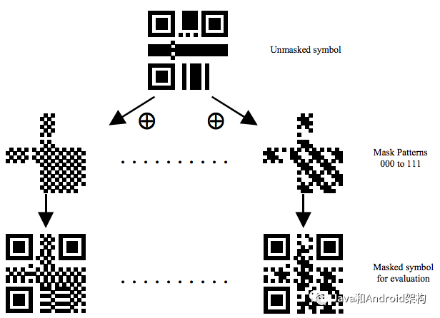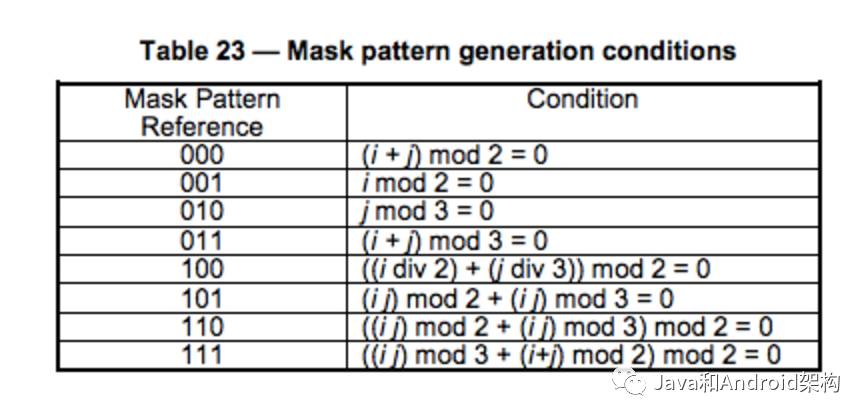 这样下来,我们的图就填好了,但是,也许那些点并不均衡,如果出现大面积的空白或黑块,会告诉我们扫描识别的困难。所以,我们还要做Masking操作(靠,还嫌不复杂)QR的Spec中说了,QR有8个Mask你可以使用,如下所示:其中,各个mask的公式在各个图下面。所谓mask,说白了,就是和上面生成的图做XOR操作。Mask只会和数据区进行XOR,不会影响功能区。(注:选择一个合适的Mask也是有算法的
