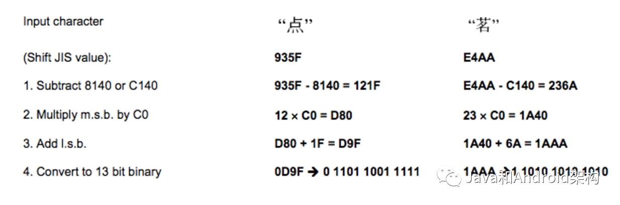 Kanji mode 这是日文编码,也是双字节编码。同样,也可以用于中文编码。日文和汉字的编码会减去一个值。如:在0X8140 to 0X9FFC中的字符会减去8140,在0XE040到0XEBBF中的字符要减去0XC140,然后把结果前两个16进制位拿出来乘以0XC0,然后再加上后两个16进制位,最后转成13bit的编码。如下图示例: