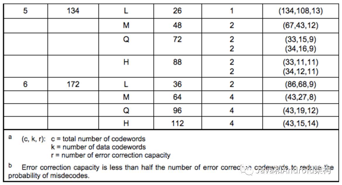 举个例子:上述的Version 5 + Q纠错级:需要4个Blocks(2个Blocks为一组,共两组),头一组的两个Blocks中各15个bits数据 + 各 9个bits的纠错码(注:表中的codewords就是一个8bits的byte)(再注:最后一例中的(c, k, r )的公式为:c = k + 2 * r,因为后脚注解释了:纠错码的容量小于纠错码的一半)