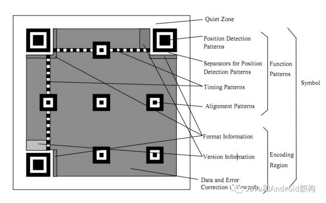 • Position Detection Pattern是定位图案,用于标记二维码的矩形大小。这三个定位图案有白边叫Separators for Postion Detection Patterns。之所以三个而不是四个意思就是三个就可以标识一个矩形了。