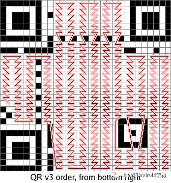 然后是填接我们的最终编码,最终编码的填充方式如下:从左下角开始沿着红线填我们的各个bits,1是黑色,0是白色。如果遇到了上面的非数据区,则绕开或跳过。