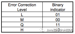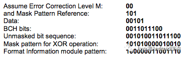 • 5个数据bits:其中,2个bits用于表示使用什么样的Error Correction Level, 3个bits表示使用什么样的Mask