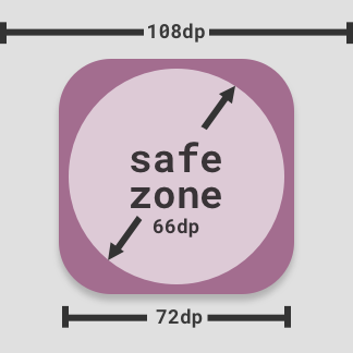 自适应图标的大小为 108dp * 108dp,但最大只能遮盖 72dp * 72dp 的面积。不同的设备可以提供不同的遮盖,但必须是凸形的(不能凹进去),图标边缘距离中心不小于 33dp。