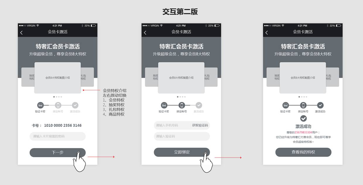 3、使用场景:用户拿到会员卡后,看到卡背面有二维码,用户下意识地用微信去扫一扫,这个时候就要去思考,用户扫完二维码后出现的页面的心理预期是什么?难道应该是像产品原型里面那样直接出现输入手机号和验证码吗?仔细想想是不符合用户心理预期的,其实用户更希望看到关于卡详细的信息,以及这个卡怎么样一个激活流程,让用户提前看到激活的步骤和操作会让用户有更好的心理安全感,另外如果能让用户直接看到升级会员后能够带来哪些好处能够享受哪些特权会更加促使用户进行升级会员的操作。