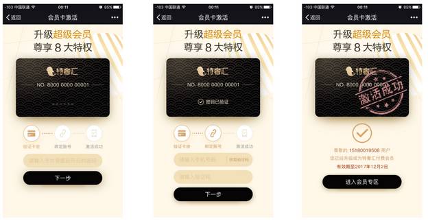嗯,现在看起来是不是页面结构清晰多了,用户通过扫描二维码进入后可以看到大大的标题“特奢汇会员卡激活”以及副标题“升级超级会员,尊享会员8大特权”从标题上就告知用户这确实是会员卡的激活流程,以及升级会员会享有8大特权,符合用户的心理预期。标题下面一块滑屏区,展示着升级会员后会享有的一些特权和好处,这个地方也是为了让用户更好地了解会员的好处并促使用户进行升级的诱发剂。滑屏区下面的步骤拆分区域也是为了更好地让用户感知到整个流程和需要操作的步骤。