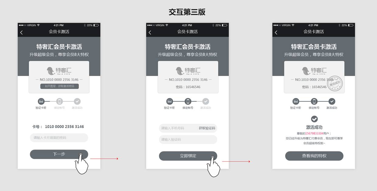 为什么要这么做?还是要回到用户本身,我们这里的主要用户群体是平台非会员用户,对我们的产品和平台有一定的关注和了解,能够接受花钱购买会员卡进行会员升级,说明他已经提前详细了解了平台会员所有的特权,并且有足够强的动力去完成会员卡激活等一系列流程。所以这个地方再次展示会员特权的意义就并不是很大了,由于考虑到用户是通过实体会员卡扫描二维码而进入的页面,所以在页面上面通过高度还原实体卡样式来展示,通过用户手中的实体卡和界面里面的卡来形成会员卡帐号的互通。当用户输入密码时,上面卡密区域也会同步进行密码输入的联动。