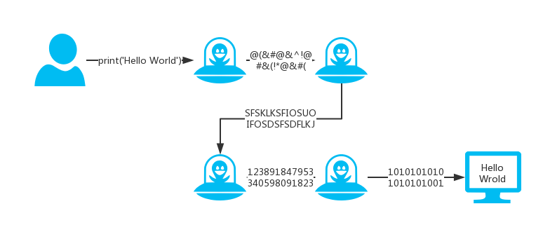 一句 「Hello World」,经过一些列的「编译」和「解释」,最终转换成一系列包含机器指令的那些0和1,机器傻傻执行完之后,告诉你结果。