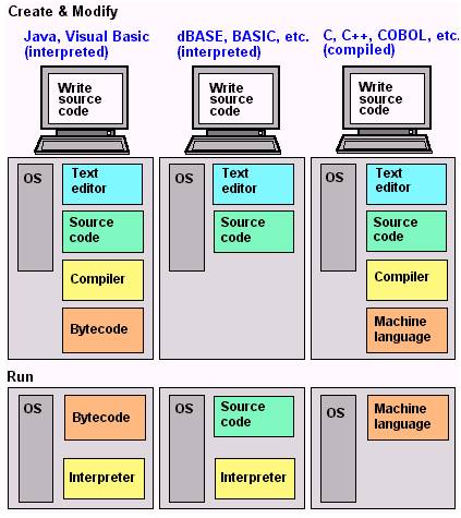 以 BASIC 语言(早期的可以由计算机直译的语言) 为例,通过文本编译器编写好,不用经历「编译」的过程,就可以直接交由操作系统内部来进行「解释」然后执行。