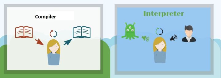 有些翻译官可以做到同声传译(解释),有些翻译官却只能把我们的意图记下来再全部翻译(编译)给计算机。