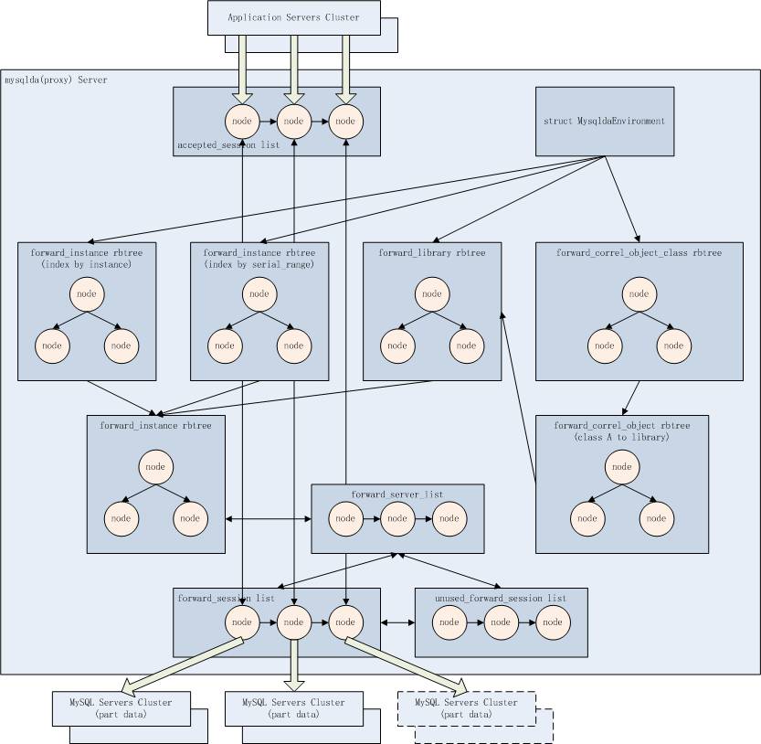 一个MySQL数据库服务器有序列表(forward_servers list)下辖一个空闲连接池(unused_forward_session list)和一个工作连接池(forward_session list)。