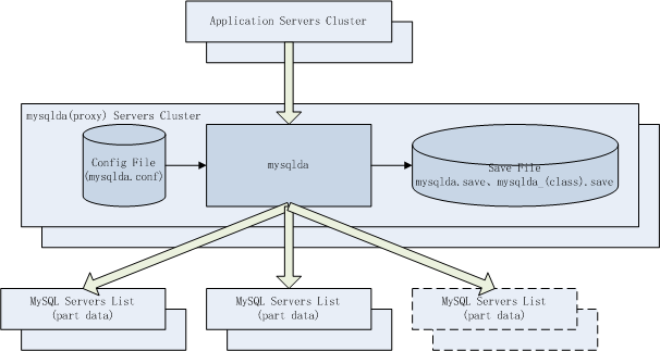 mysqlda数据库中间件完全遵循MySQL通讯协议桥接应用服务器集群和MySQL数据库集群。