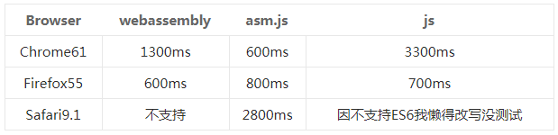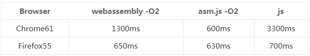 居然没什么变化, 大失所望。号称asm.js可以达到native的50%速度么,这个倒是好像达到了。但是今年Compiling for the Web with WebAssembly (Google I/O ‘17)里说WebAssembly是1.2x slower than native code,感觉不对呢。asm.js还有一个好处是,它就是js,所以即使浏览器不支持,也能当成不同的js执行,只是没有加速效果。当然WebAssembly受到各大厂商一致推崇,作为一个新的标准,肯定前景会更好,期待会有更好的表现。