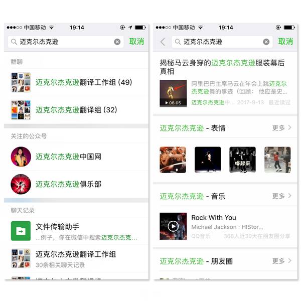 举一个例子,你在微信中搜索“迈克尔杰克逊”,搜索结果会出现名称中带有迈克尔杰克逊的群聊/好友,关注的公众号,聊天记录,还有收藏记录。当你点开更多,你还会看到关于迈克尔杰克逊的新闻资讯,表情包,音乐,朋友圈等。如果你刚使用微信不久,通过这个搜索结果你就会对微信可以提供的服务有了大致的了解。所以说通过建立搜索功能可以帮助你很好的了解一款产品。