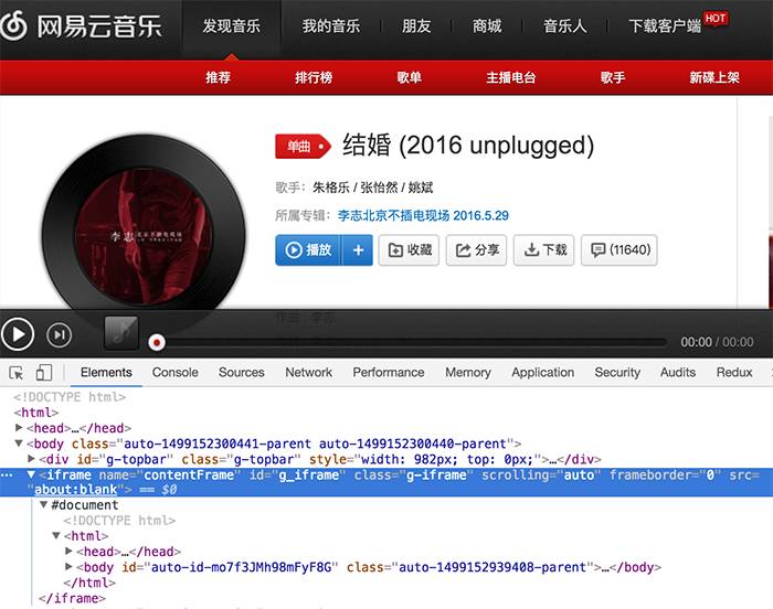 网易云音乐页面一打开,html源码里几乎只有一个iframe,并且它的src是空白的:about:blank。接着js开始运行,把整个页面的框架异步塞到了iframe 里面…