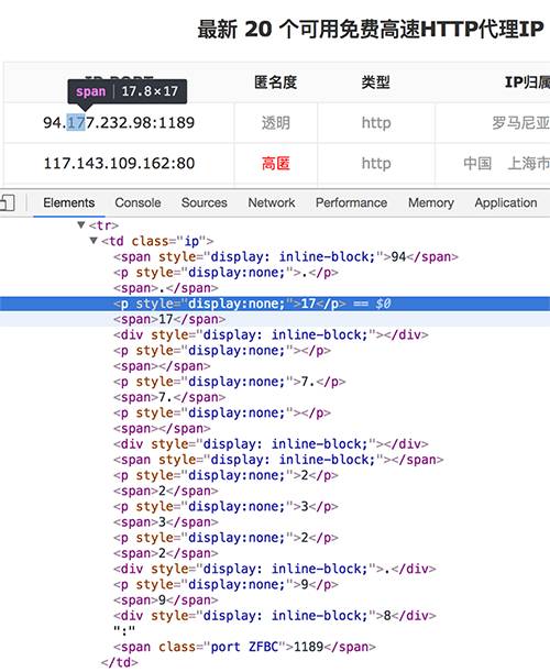 他们会先把IP的数字与符号分割成dom节点,再在中间插入迷惑人的数字,如果爬虫不知道这个策略,还会以为自己成功拿到了数值;不过如果爬虫注意到,就很好解决了。