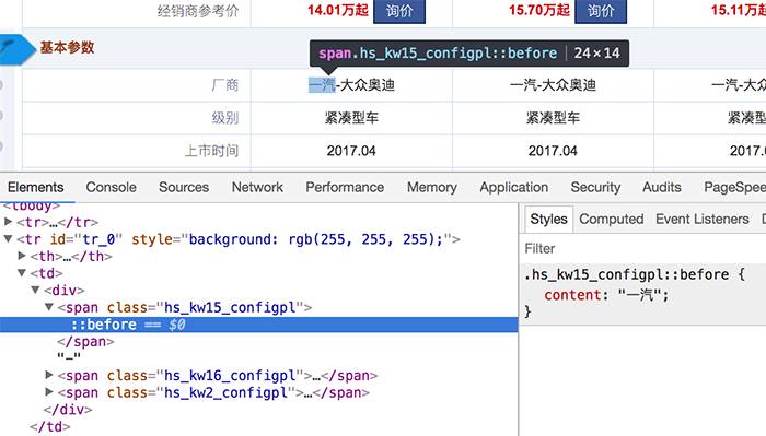 汽车之家里,把关键的厂商信息,做到了伪元素的content里。