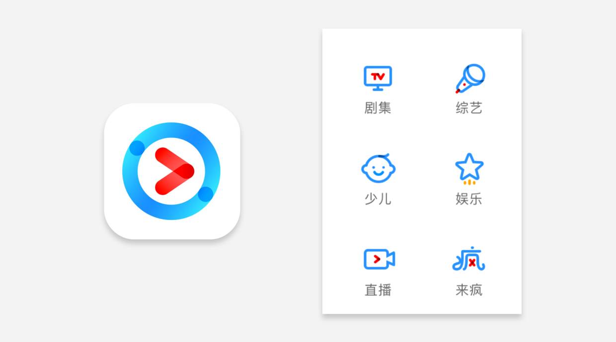但是大家仔细观察优酷这套图标,我们会发现除了颜色基因以外,好像在logo上还提取了一个叠层的效果,而这种叠层的效果又属于另外一种品牌基因——风格特点,我们继续往下看。