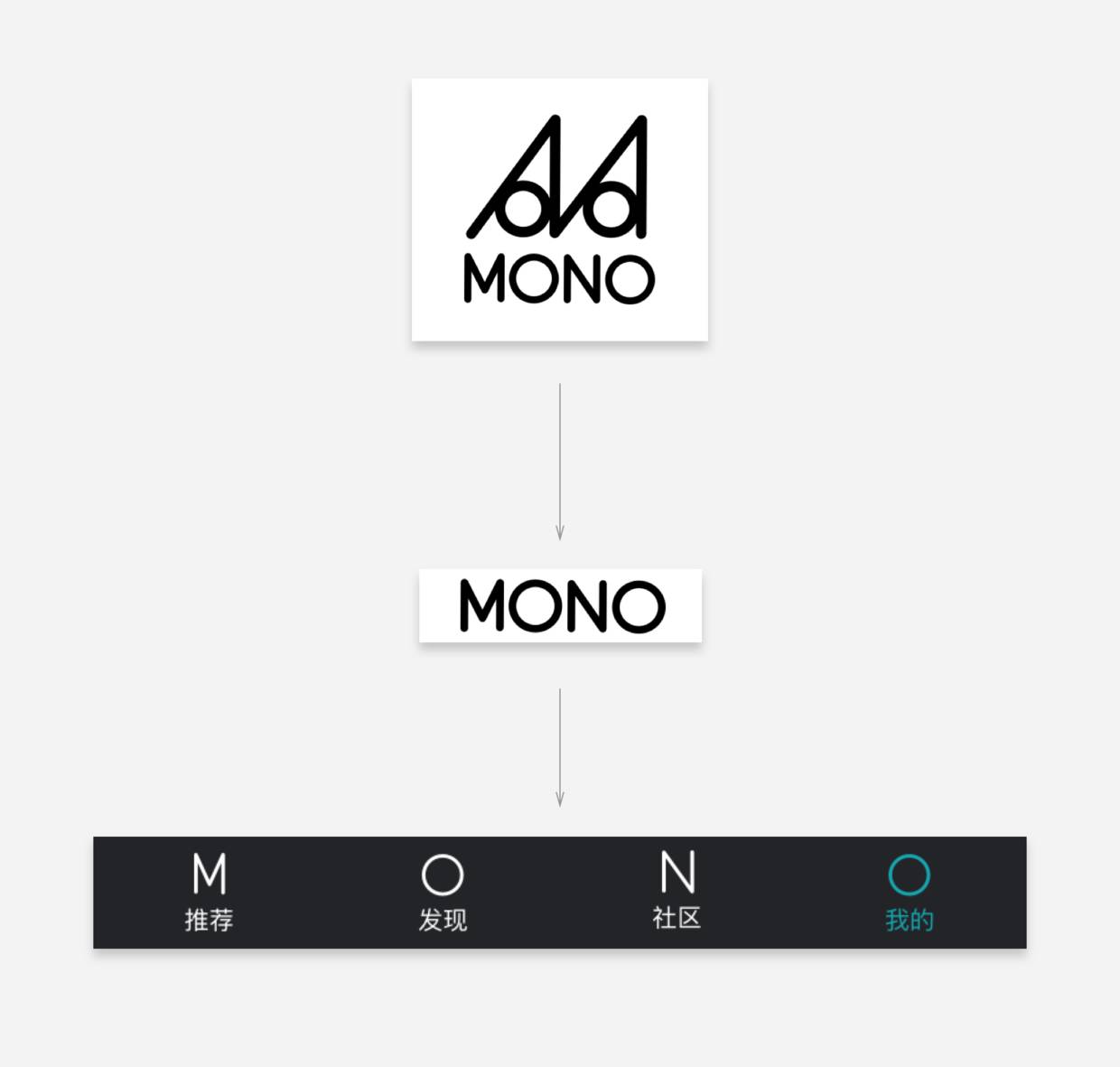 再比如MONO的标签栏图标,设计的非常大胆,提取logo上面的4个字母——M、O、N、O后,直接将其作为图标,如下图: