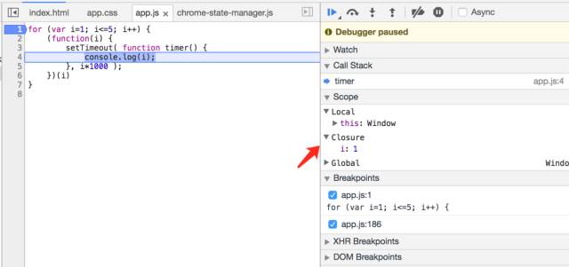 利用断点调试,在chrome中查看执行顺序与每一个闭包中不同的i值