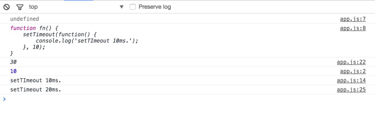 每一个setTimeout在执行时,会返回一个唯一ID,上图中的数字7,就是这个唯一ID。我们在使用时,常常会使用一个变量将这个唯一ID保存起来,用以传入clearTimeout,清除定时器。