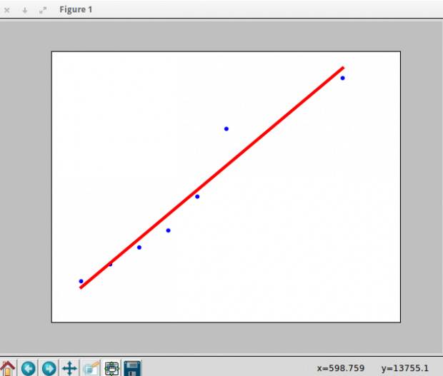 脚本输出:Intercept value 1771.80851064 coefficient [ 28.77659574] Predicted value: [ 21915.42553191] [Finished in 0.7s]