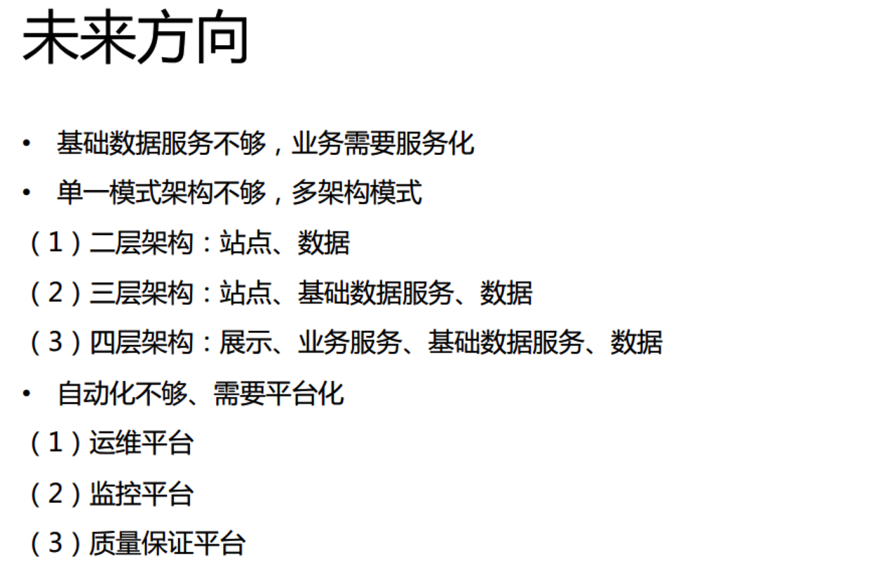 最后做一个小的总结,网站在不同的阶段遇到的问题不一样,而解决这些问题使用的技术也不一样,流量小的时候,主要目的是提高开发效率,在早期要引入ORM,DAO这些技术。随着流量变大,使用动静分离、读写分离、主从同步、垂直拆分、CDN、MVC等方式不断地提升网站稳定性。面对更大的流量时,通过垂直拆分、服务化、反向代理、开发框架(站点/服务)等等,不断提升高可用。在面对上亿级的更大流量时,通过中心化、柔性服务、消息总线、自动化(回归,测试,运维,监控)来迎接新的挑战。未来的就是继续实现.
