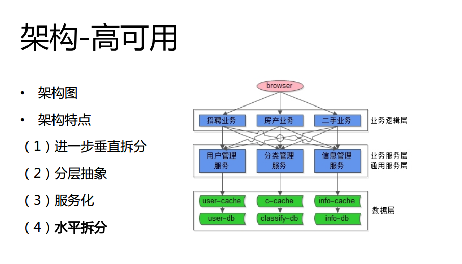 另一点就是关于数据库,当某一点成为一个业务线重点的时候,就会集中解决这个点的问题。最初期的时候每个业务线都要访问数据库,访问缓存,访问用户数据,于是把代码集中的放到了服务层。现在数据量越来越大,大家都要做数据切分,每个业务线都做切分,这个时候58同城的每个页面都面对这样的痛点,于是把这个痛点拿到集中的层面来解决。