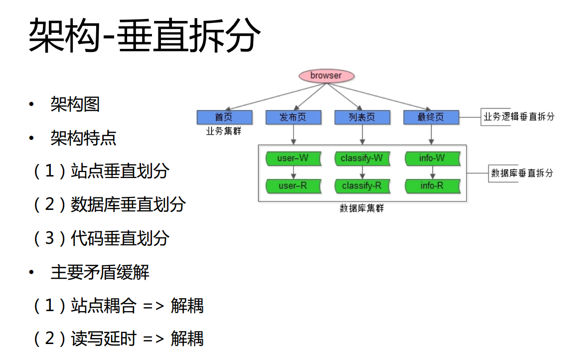 首先,使用了一些非常常见的技术,一方面是动静分离,动态的页面通过Web-Servre访问,静态的像图片等就单独放到了一些服务器上。另外一点就是读写分离。其实,对58同城或者说绝大部分的站点而言,一般来说都是读多写少。对58同城来说,绝大部分用户是访问信息,只有很少的用户过来发贴。那么如何扩展整个站点架构的读请求呢?常用的是主从同步,读写分离。同时原来只有一个数据库,现在使用多个不同的数据库提供服务,这样的话,就扩展了读写,很快就解决了中等规模下数据访问的问题。