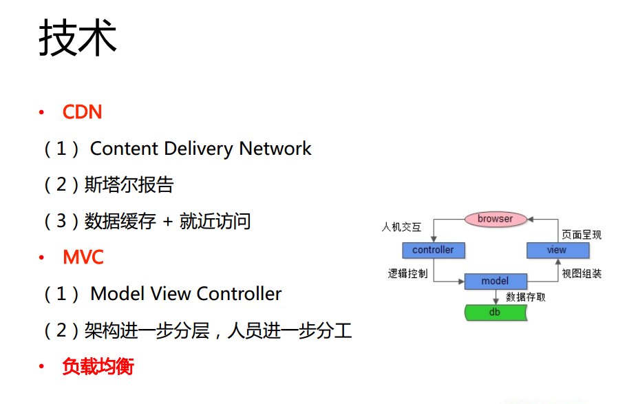 当时,还使用了一些技术,前面也提到了对动态资源和静态资源进行拆分。其中,我们对静态资源使用了CDN服务,便于数据缓存和就近访问,访问速度得到很明显的提升。除此之外,还使用了MVC模式,擅长前端的去做展示层,擅长协作逻辑的工程师就做Contorller,擅长数据的人就负责数据,效率就会逐步的提高,最后就是负载均衡技术。