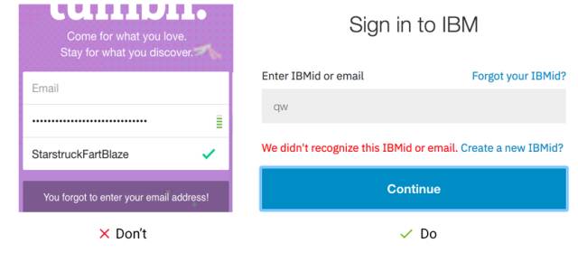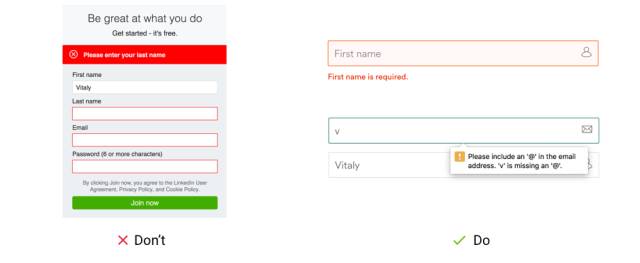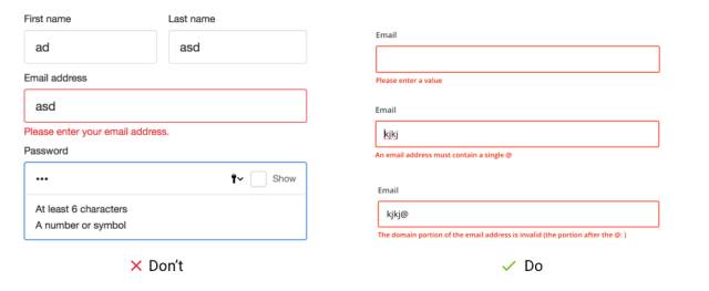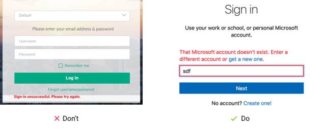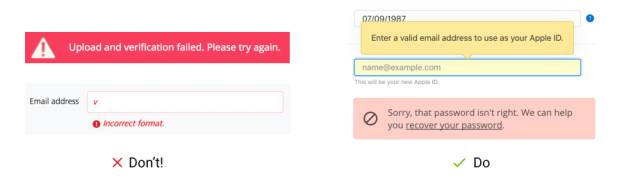 好的错误信息是在需要时看到。避免错误摘要,将错误消息放在与他们相关的用户界面元素旁边。