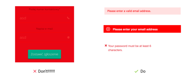 通常红色用于错误的消息文本。在某些情况下,使用黄色或橙色的消息文本,因为红色对用户来说有很大压力。在这两种情况下,请确保错误文本清晰可辨,且与其背景的颜色有显着的对比。针对色盲用户,不要忽略在旁边提供相关图标的颜色。