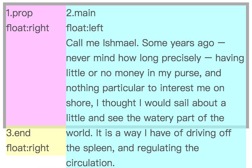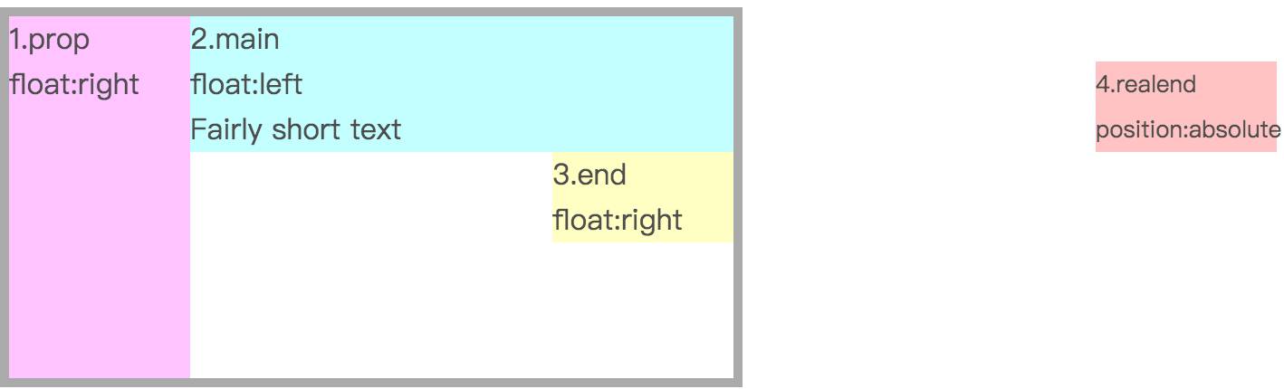 这一步中,我们主要关心的是realend元素的定位,基于浮动后的end元素设置偏移量,当end元素浮动到第一节第二章图的位置时(即在prop元素的下方),此时realend元素正好处在end元素的上方50px,右侧300px-100px=200px处,而该位置正是父包含框wrap元素的右下角,此时正是我们期待的结果: