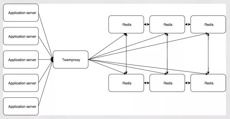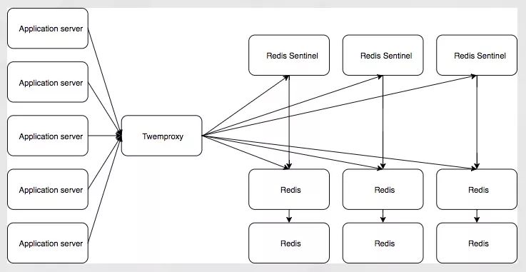 将会有大量的应用服务器与 twemproxy 进行通信,这会将它们的调用路由到合适的 Redis 主节点,twemproxy 将从 sentinal 集群获取主节点的信息,它将控制哪台 Redis 实例是主,哪台是从。这个设置是复杂的,而且仍有单点故障,它依赖于 twemproxy 来处理分片,来连接到正确的 Redis 实例。它具有对应用程序透明的优点,所以我们可以在理论上做到将现有的应用程序转移到这个 Redis 配置,而不用改变应用程序。但是我们要从头开始构建一个应用程序,所以迁移应用程序不是一个必需条件。