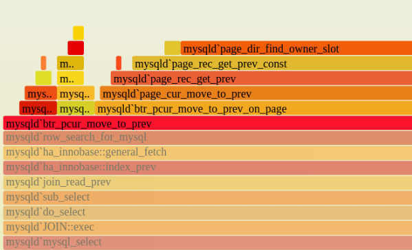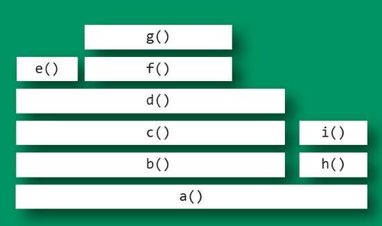 上面图片中,最顶层的函数g()占用 CPU 时间最多。d()的宽度最大,但是它直接耗用 CPU 的部分很少。b()和c()没有直接消耗 CPU。因此,如果要调查性能问题,首先应该调查g(),其次是i()。