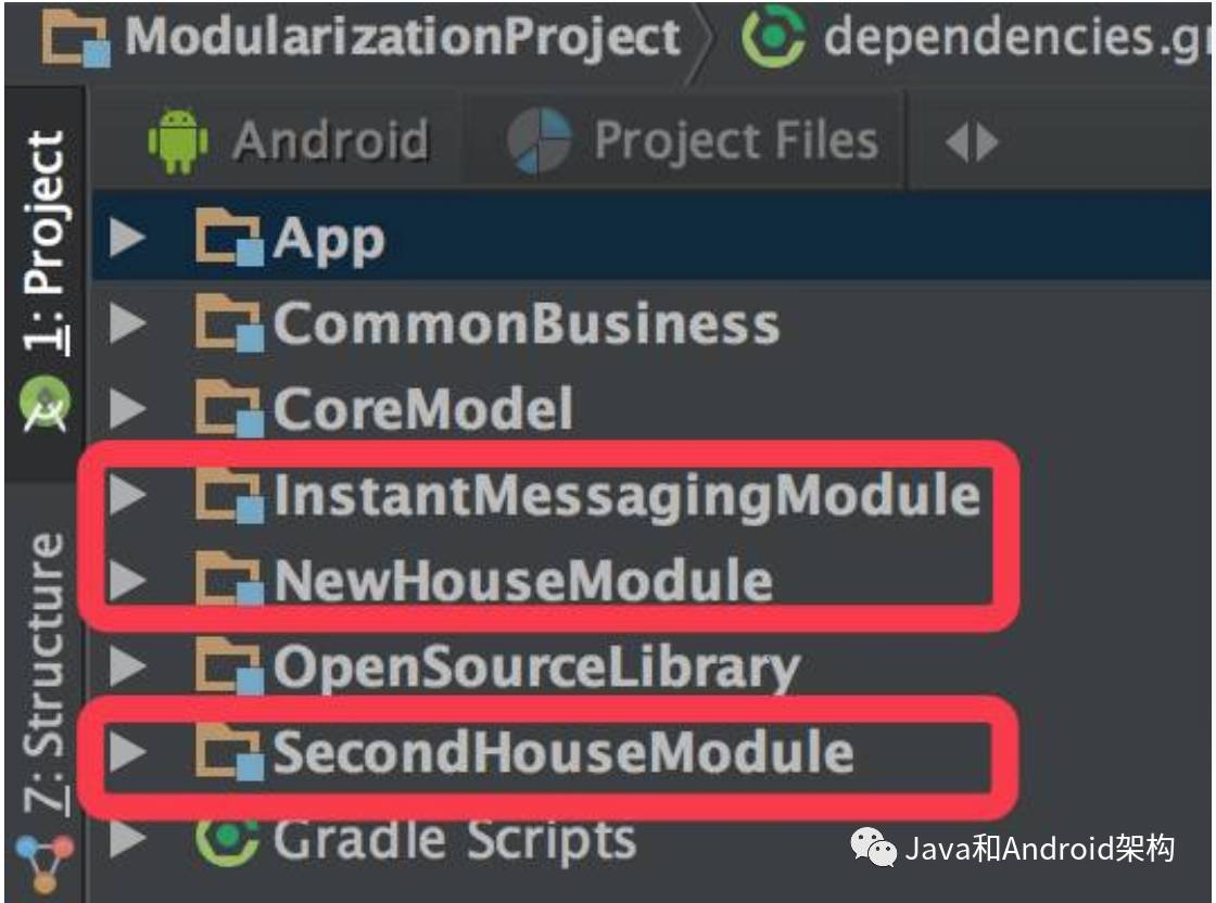 我们在谈模块化的时候,其实就是将业务模块层的各个功能业务拆分层独立的业务模块。所以我们进行模块化的第一步就是业务模块划分,但是模块划分并没有一个业界通用的标准,因此划分的粒度需要根据项目情况进行合理把控,这就需要对业务和项目有较为透彻的理解。拿安居客来举例,我们会将项目划分为新房模块、二手房模块、IM 模块等等。