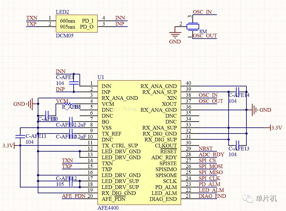数据手册介绍到此结束。不废话,接下来介绍电路原理图。原理图也是根据数据手册的典型应用得到的。两个红光和红外LED选用的是DCM05(或者DCM03)