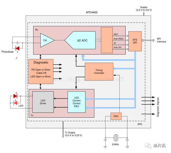 AFE4400 是一款非常适合于脉冲血氧仪应用的完全集成模拟前端 (AFE)。 此器件包含一个具有集成模数转换器 (ADC) 的低噪声接收器通道、一个 LED 发射部件和针对传感器以及 LED 故障检测的诊断功能。