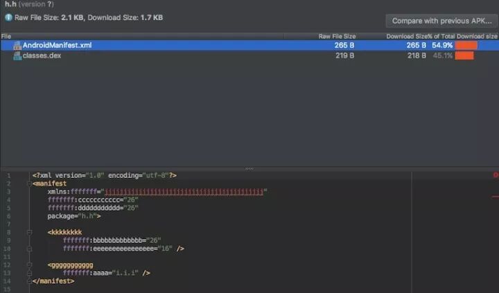 看上去AndroidManifest文件非常类似于我们的原始输入文件。唯一差别在于,文件中的字符串和 Drawable 等资源被整数资源 ID 所替代,这些 ID 以0x7F开头。